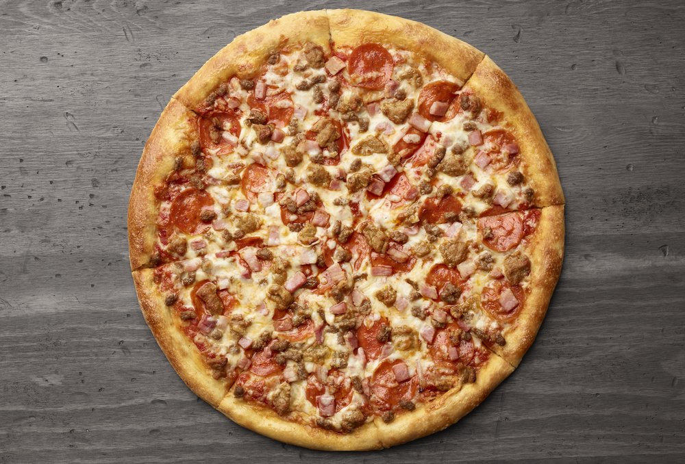 Extra ground beef, bacon, onion, mozzarella & cheddar cheese. Served on thin crust